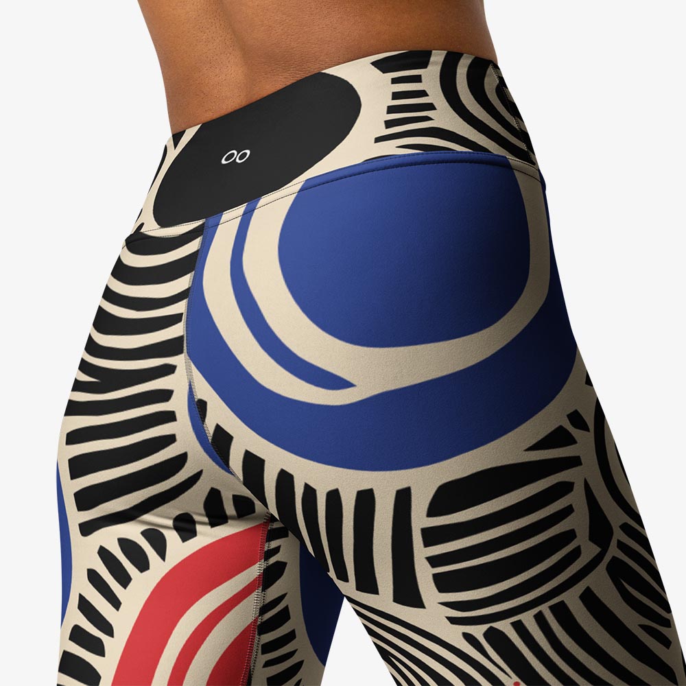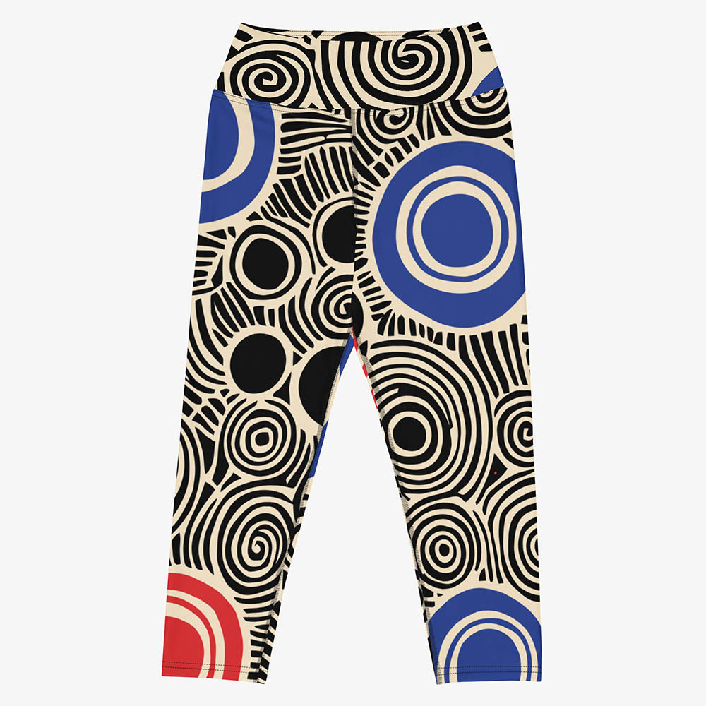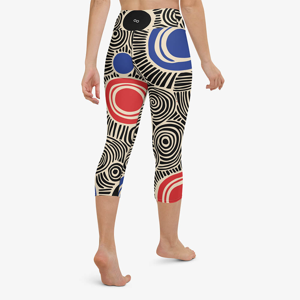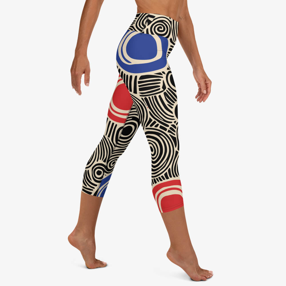 Experience the perfect blend of comfort and style with our "Vertigo" yoga capris, featuring an engaging spiral pattern with vibrant blue and red accents.