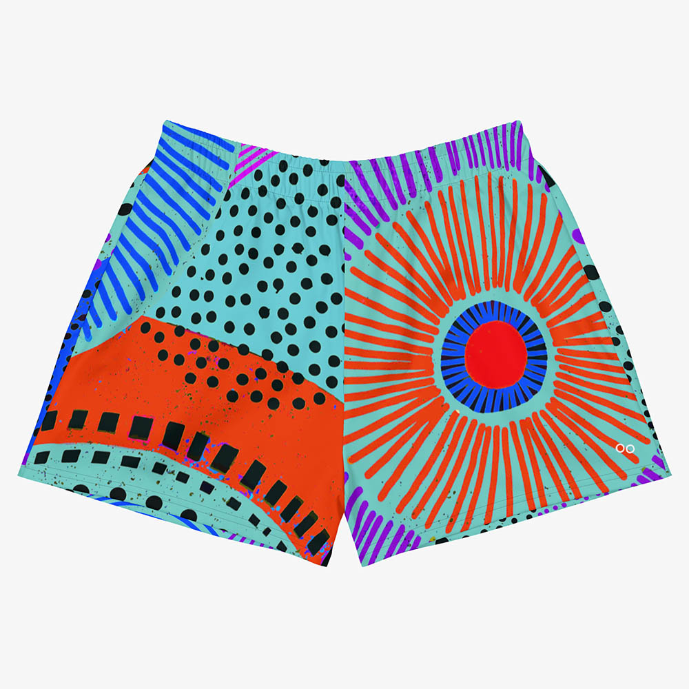 Looking to make a statement? These "Ethno Pop" shorts are the perfect way to catch everyone's eye with their one-of-a-kind print. Hand-drawn motifs enhance their charm and the 4-way stretch material provides superior comfort and breathability. Plus, there are 2 practical mesh pockets and a white elastic waistband for easy access to your essentials.