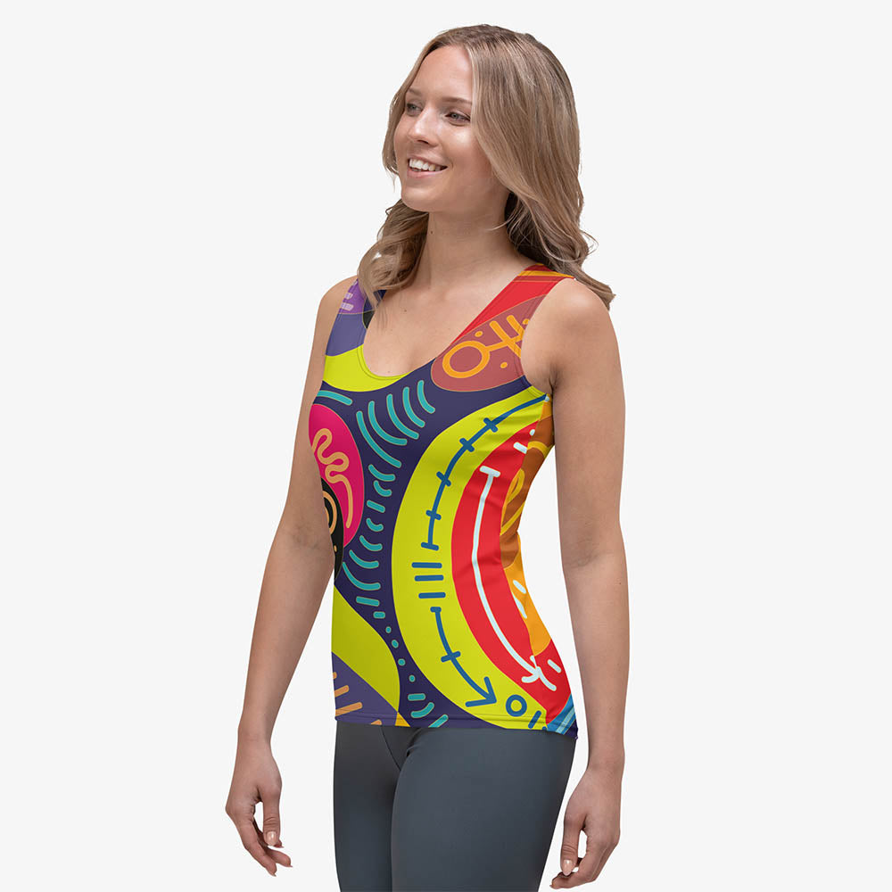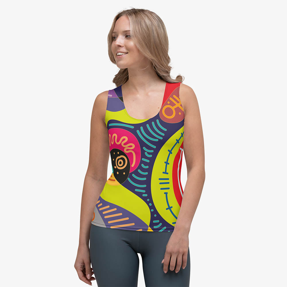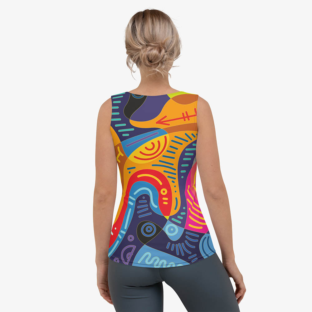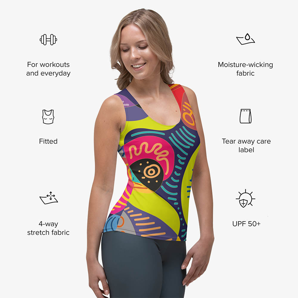 Add an element of fun to your wardrobe with the "Funky Batik" tank top. Its vibrant colors and whimsical designs are sure to make a statement. Pair it with high-waisted bottoms and experience the comfort and flexibility of the stretchy fabric all day and night!