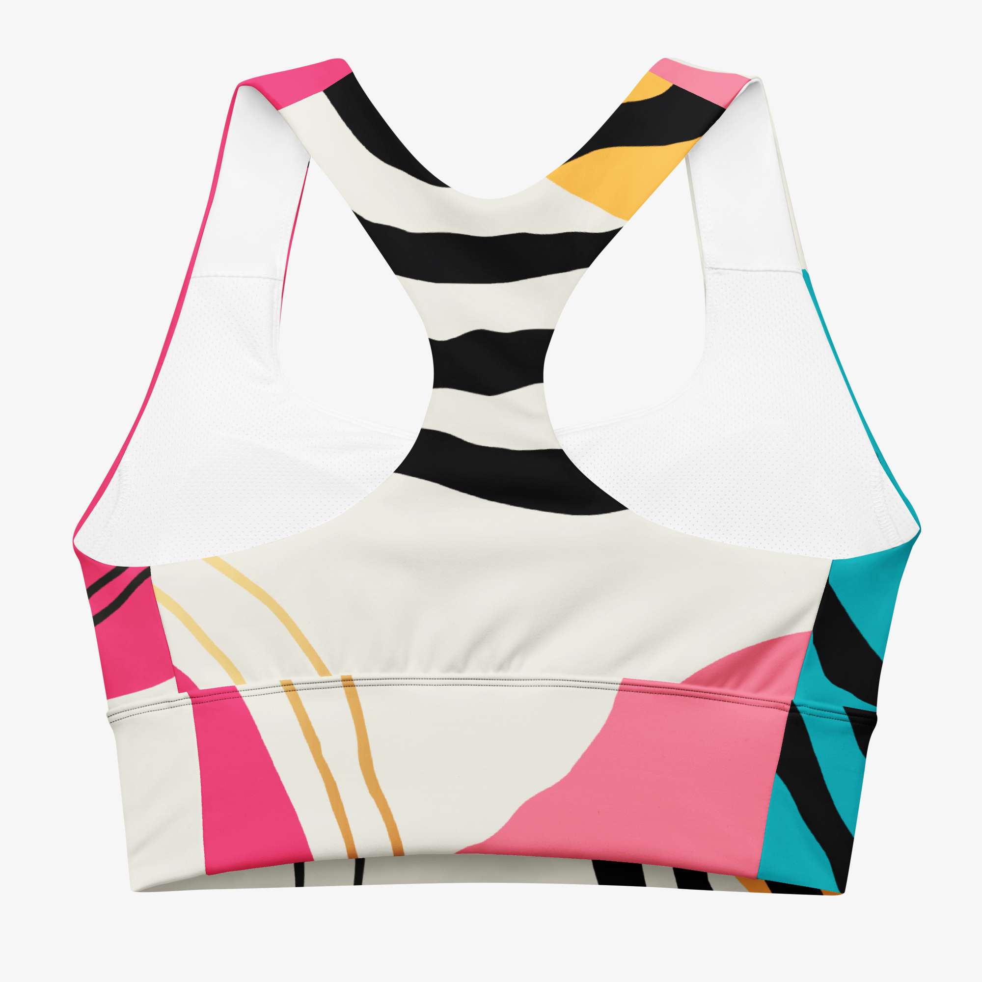 Stand out from the crowd with this modernist-inspired sports bra. The vibrant fuchsia and turquoise colors and unique design make it a stylish choice for any workout. The high-quality fabric provides support and flexibility, ensuring maximum comfort during any activity.