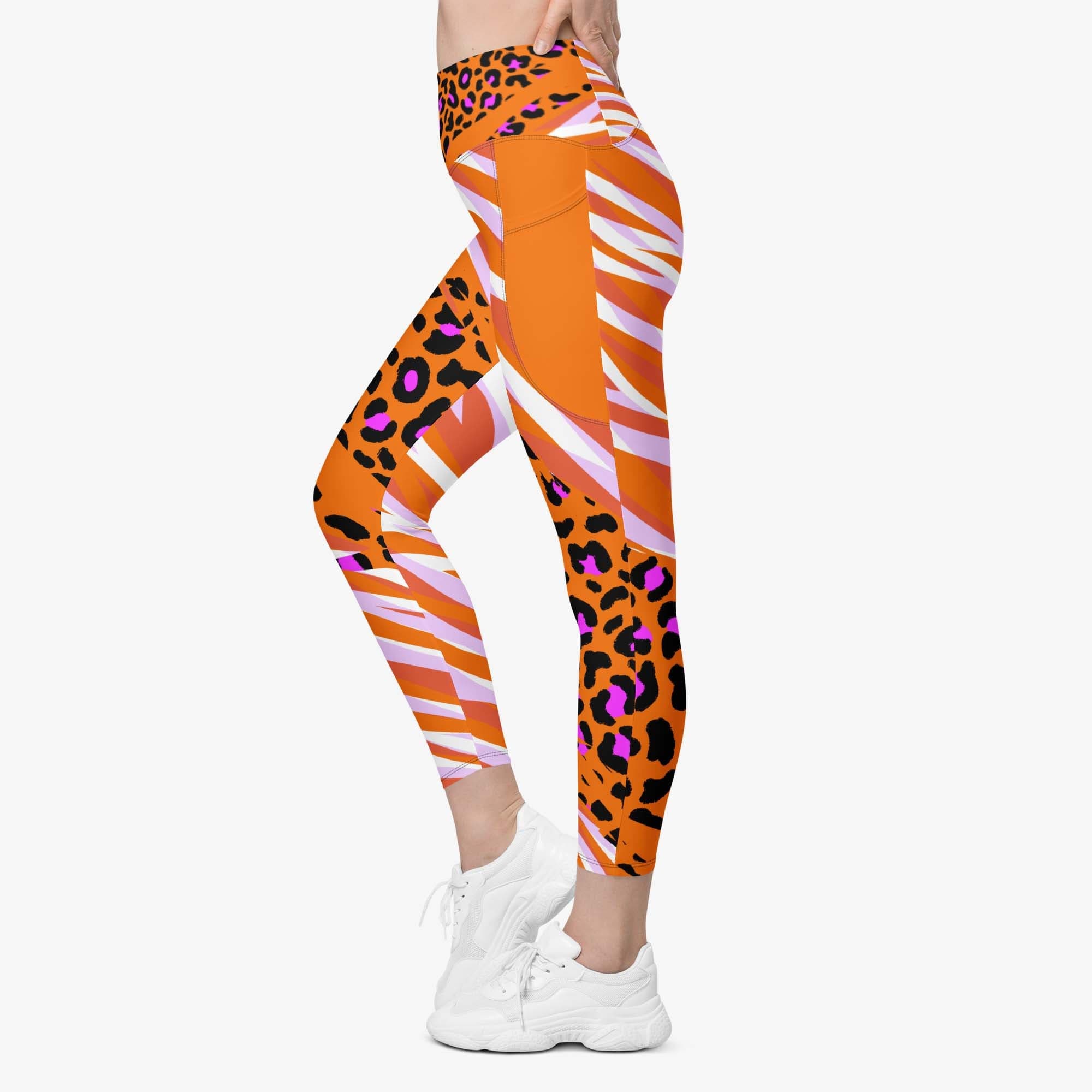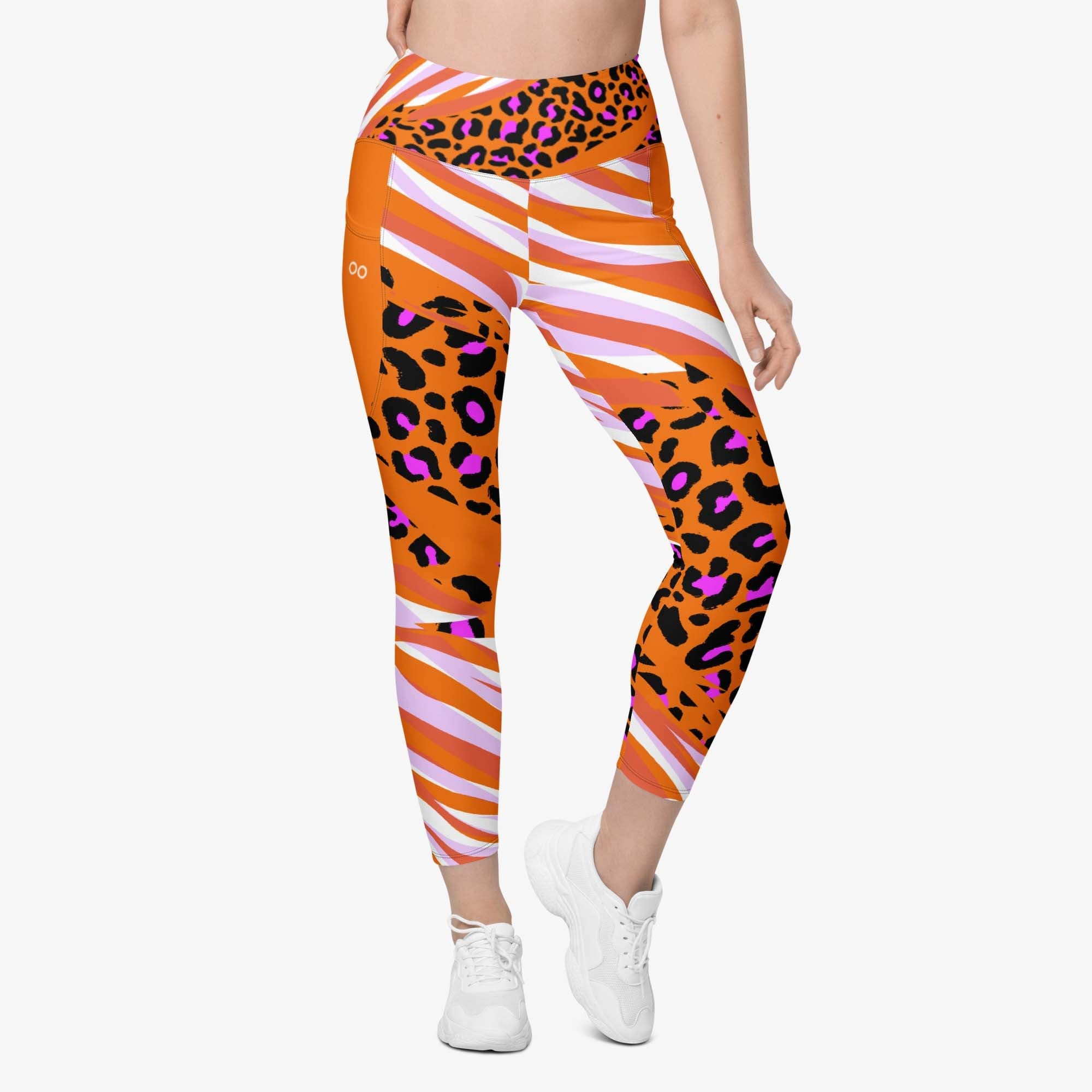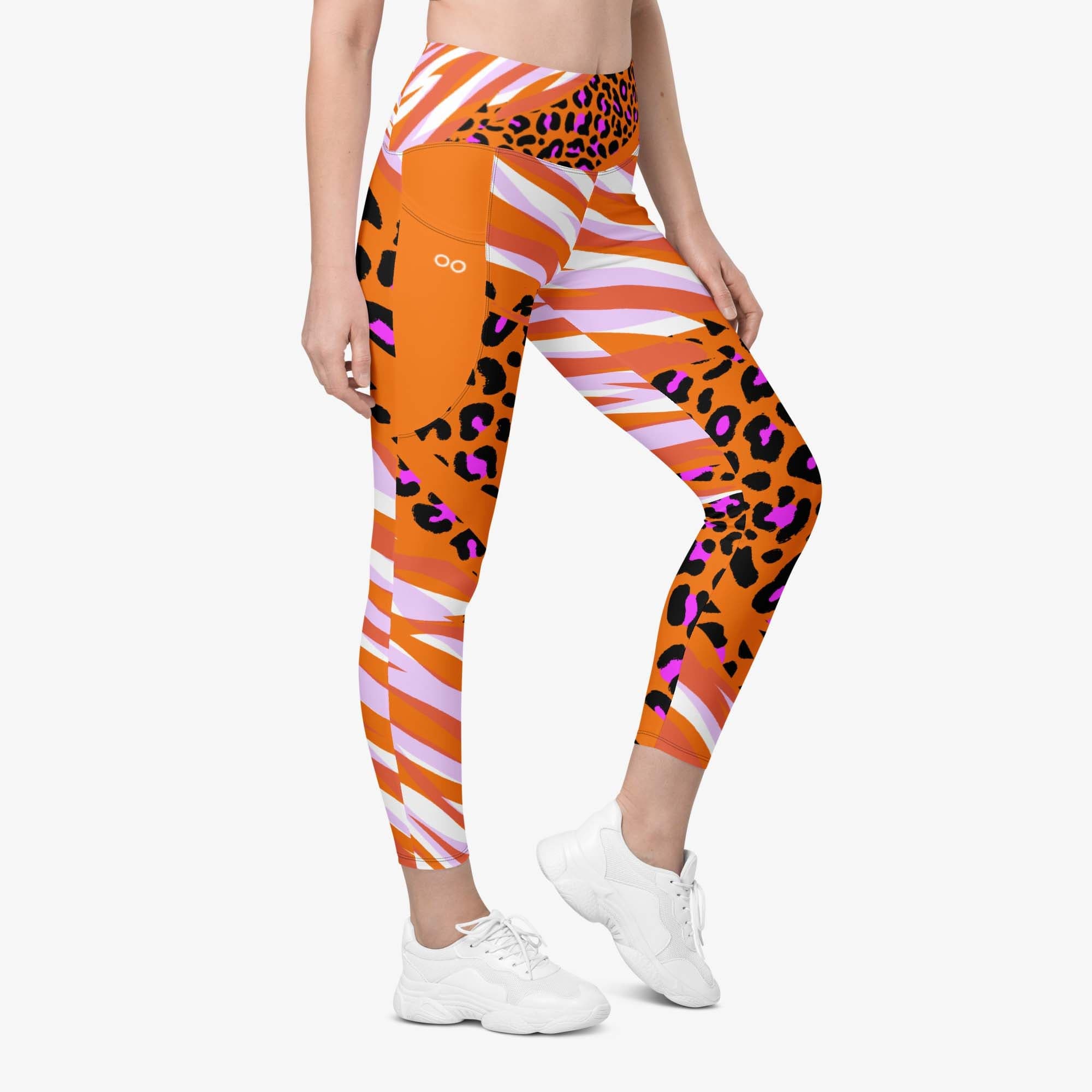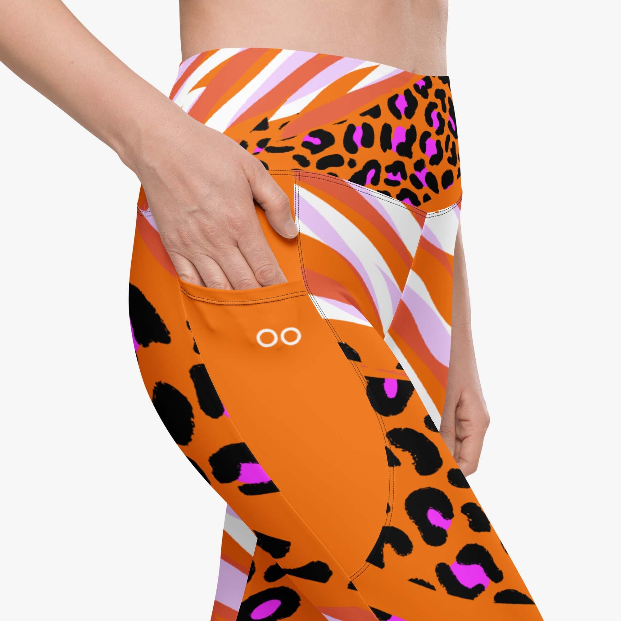 Take a walk on the wild side with these orange cheetah print leggings. Featuring a bold and fierce design, these leggings also have convenient pockets to store your phone or other small items during your workout.